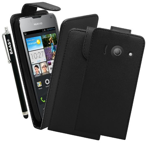BAAS® Coque Huawei Ascend Y300 Noir Etui Cuir Clapet Housse + 3x Film de Protection d'Ecran + Stylet Pour Ecran Tactile Capacitif