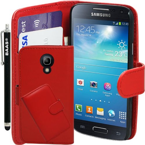 BAAS® Samsung Galaxy S4 Mini i9190 Rouge Etui Housse Coque en Cuir Portefeuille + Stylet Pour Ecran Tactile + 2 x Film de Protection d'Ecran